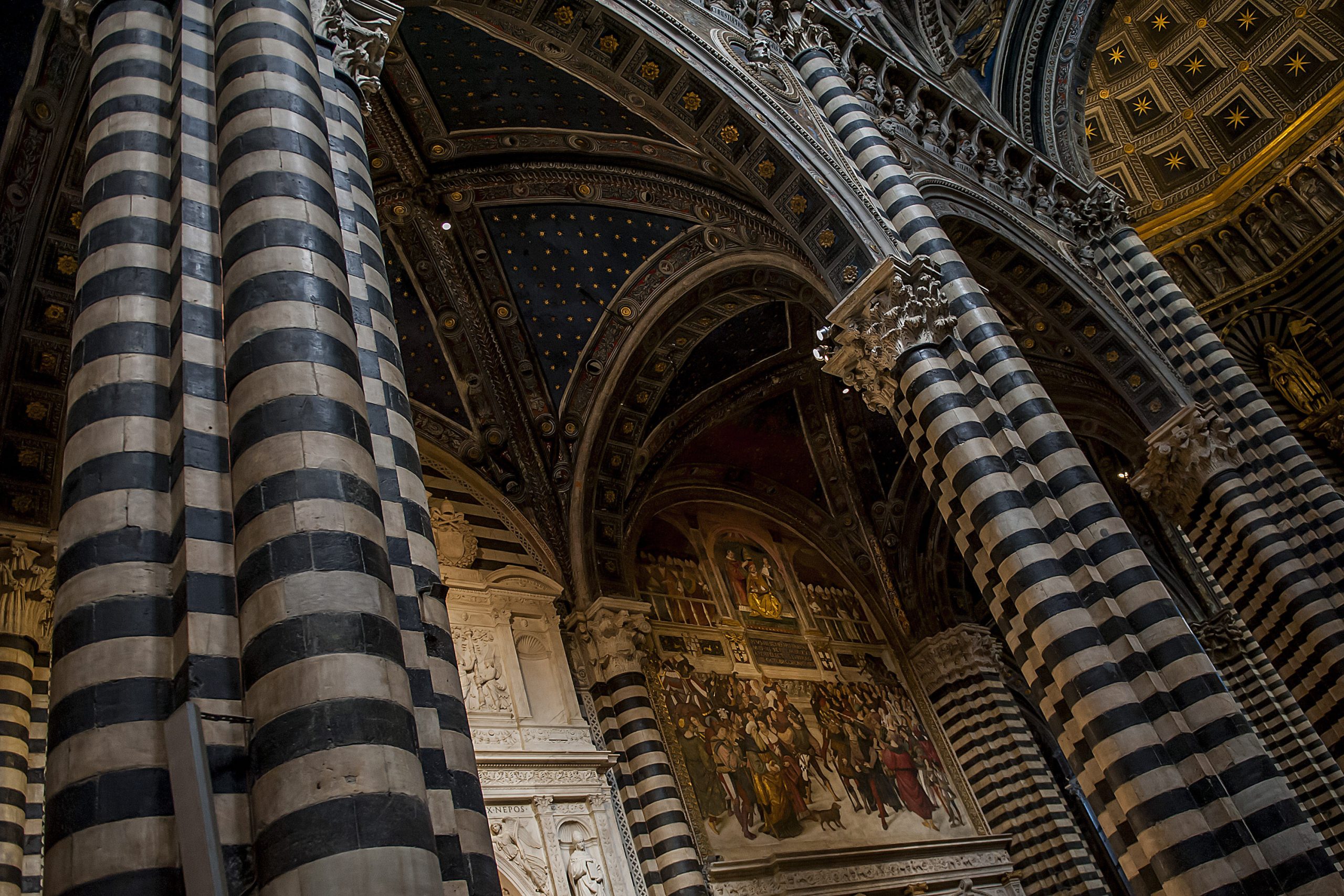The distinctive Gothic architecture of the cathedral with its green and white marble exterior offers just a tiny taste of what awaits inside. The interior walls and floors of the cathedral are adorned with intricate mosaics and etched panels, and there are also priceless works by Donatello, Pisano and the famous rose window by Duccio di Buoninsegna.